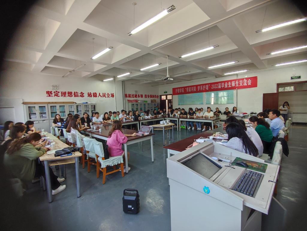 近日,开云在员工发展中心三楼素质拓展中心举办2022届毕业生“情留何院 梦系护理”师生交流会。公司党委书记、各办公室主任、教研室主任、毕业班班主任、全体辅导员和毕业生代表共70余人参加。