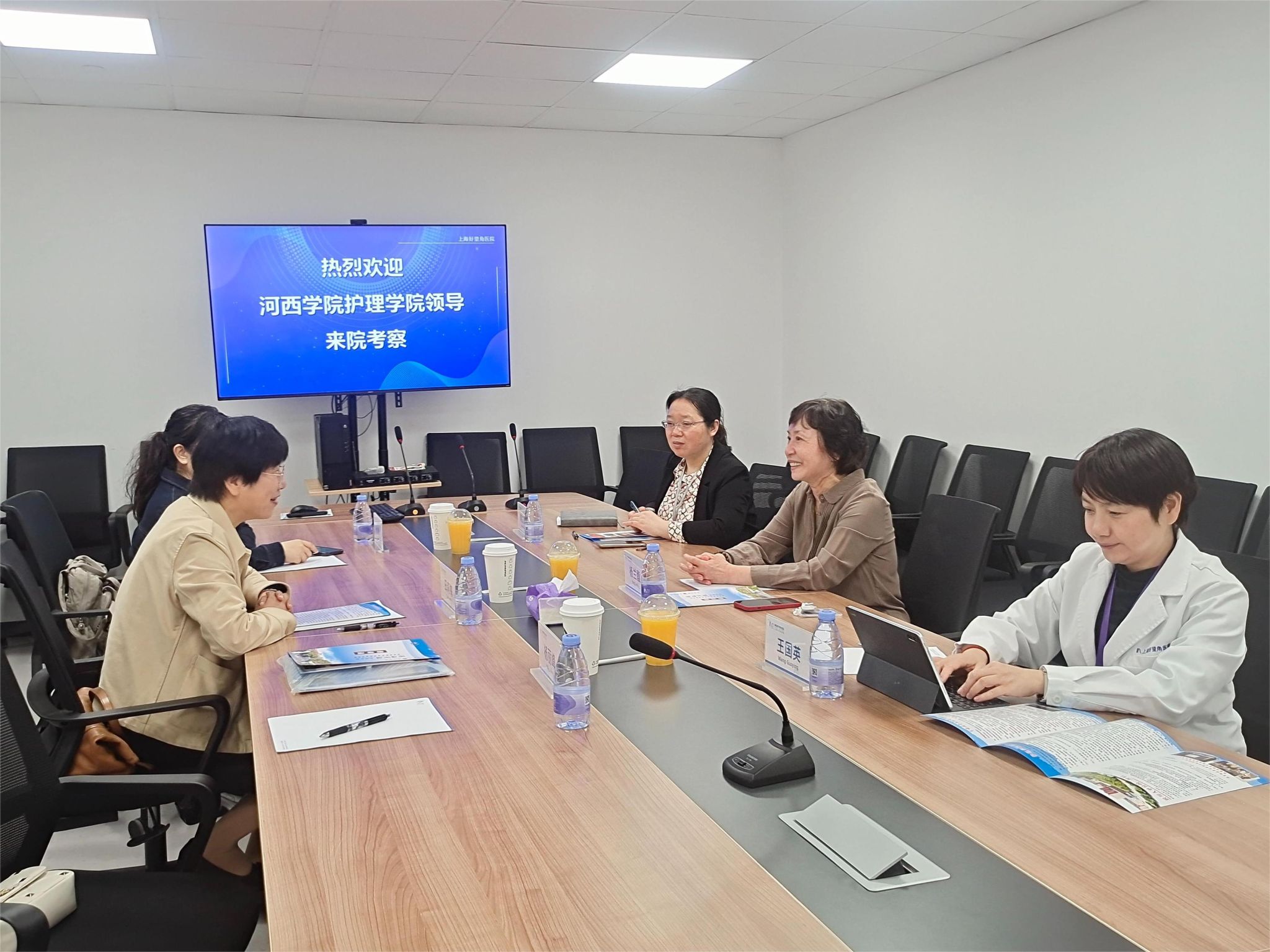 在上海徐汇区中心医院,田莉梅教授与医院相关部门负责人座谈,了解了公司员工实习表现及毕业生留院工作情况。双方就护理专业发展趋势及员工职业核心能力要求深入交流,医院对公司员工实习表现给予高度评价,并表达了进一步加强合作的意愿。