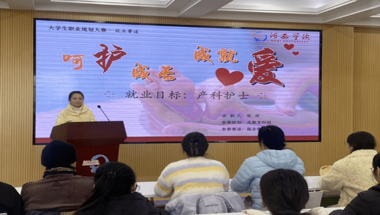 第二届全国老员工职业规划大赛甘肃省分赛决赛金奖获得者、开云专升本员工张卓向师生分享了参赛的心得体会,并以参赛PPT现场进行了路演展示。