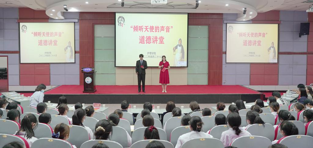 本次道德讲堂活动分学习模范、引领示范、诵读经典、畅谈感悟、发出倡议和坚心守志等六个环节。与会师生观看了第48届南丁格尔奖获得者脱亚莉的感人事迹——守护生命的“天使”;2名实习毕业生代表讲述了她们主动请缨,积极参与疫情防控,争做最美“逆行者”的心路历程和感人事迹;集体诵读《大医精诚》,与会同学线下线上畅谈感悟,员工党团学组织向全院同学发出《崇德奉献、励志成才》倡议书,与会师生集体重温南丁格尔誓言。