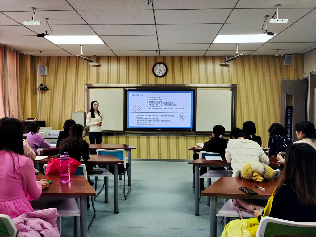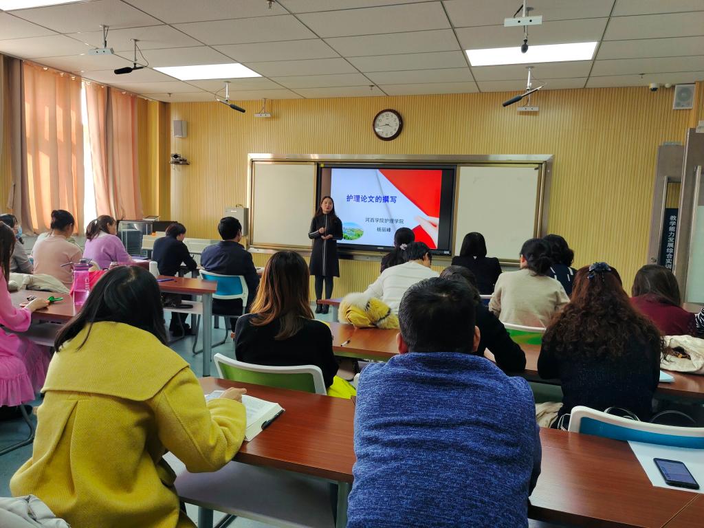 杨丽峰结合项目申报经验,以护理论文的分类为切入点,重点对科研论文和综述撰写过程中存在的问题进行了梳理和阐释,对教师撰写论文和指导员工完成毕业论文具有很好的参考价值;王继培的报告从研究背景、研究方案、研究结果、结论、研究不足等五个方面的内容进行了阐述,让全体教师对穴位贴敷治疗婴幼儿肺炎有了新的认识。